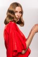 Modelul poarta masura 36, dimensiuni model: 174 cm inaltime, 81 cm bust, 59 cm talie, 87cm sold
