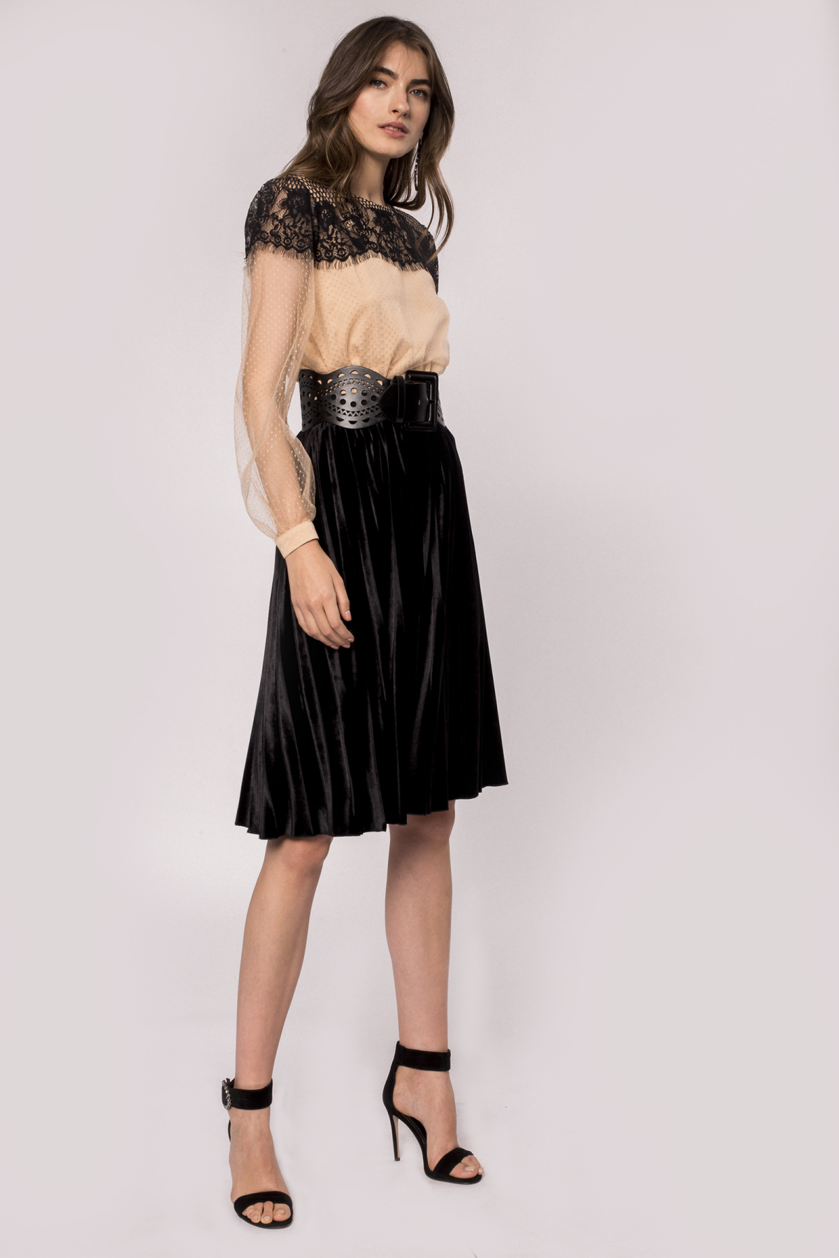 The model wears 36 size, model dimensions: 180 cm tall, 89 cm bust, 60 cm waist, 89 cm hips