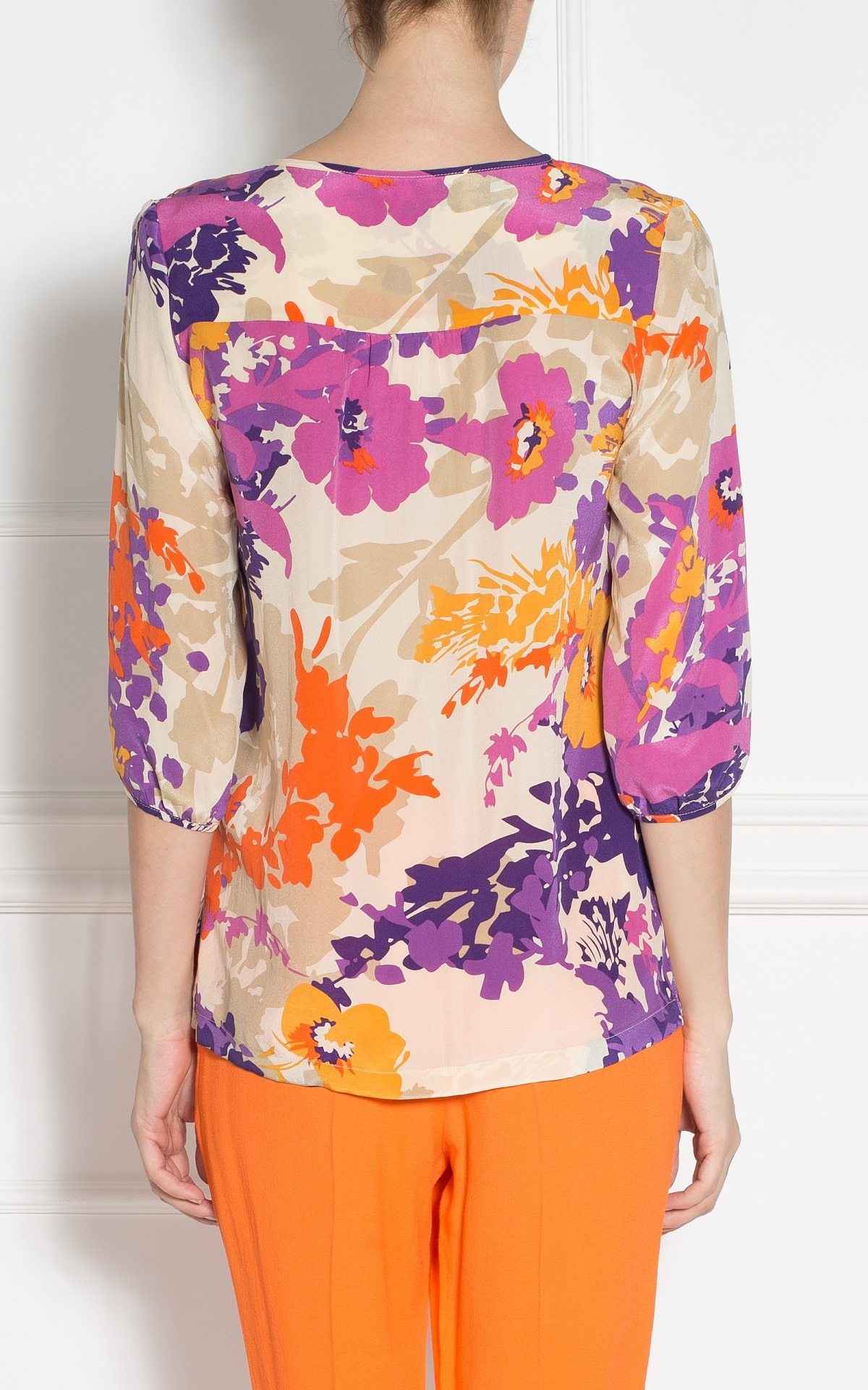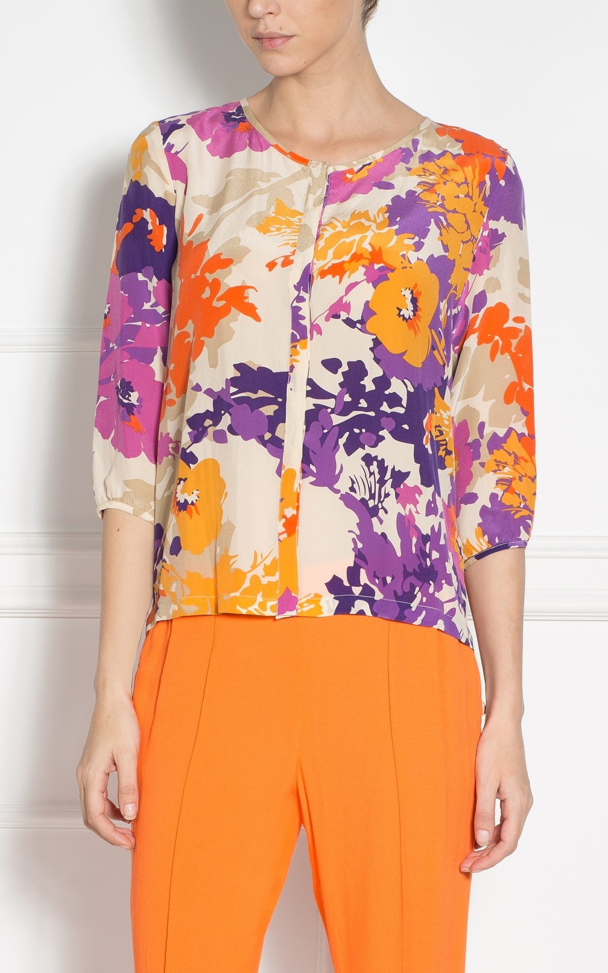 100% silk shirt with round neckline, 3/4 sleeves and pearlescent hidden buttons. Wear this top with classic pants at the office or in the weekend with a pair of jeans and flats.
