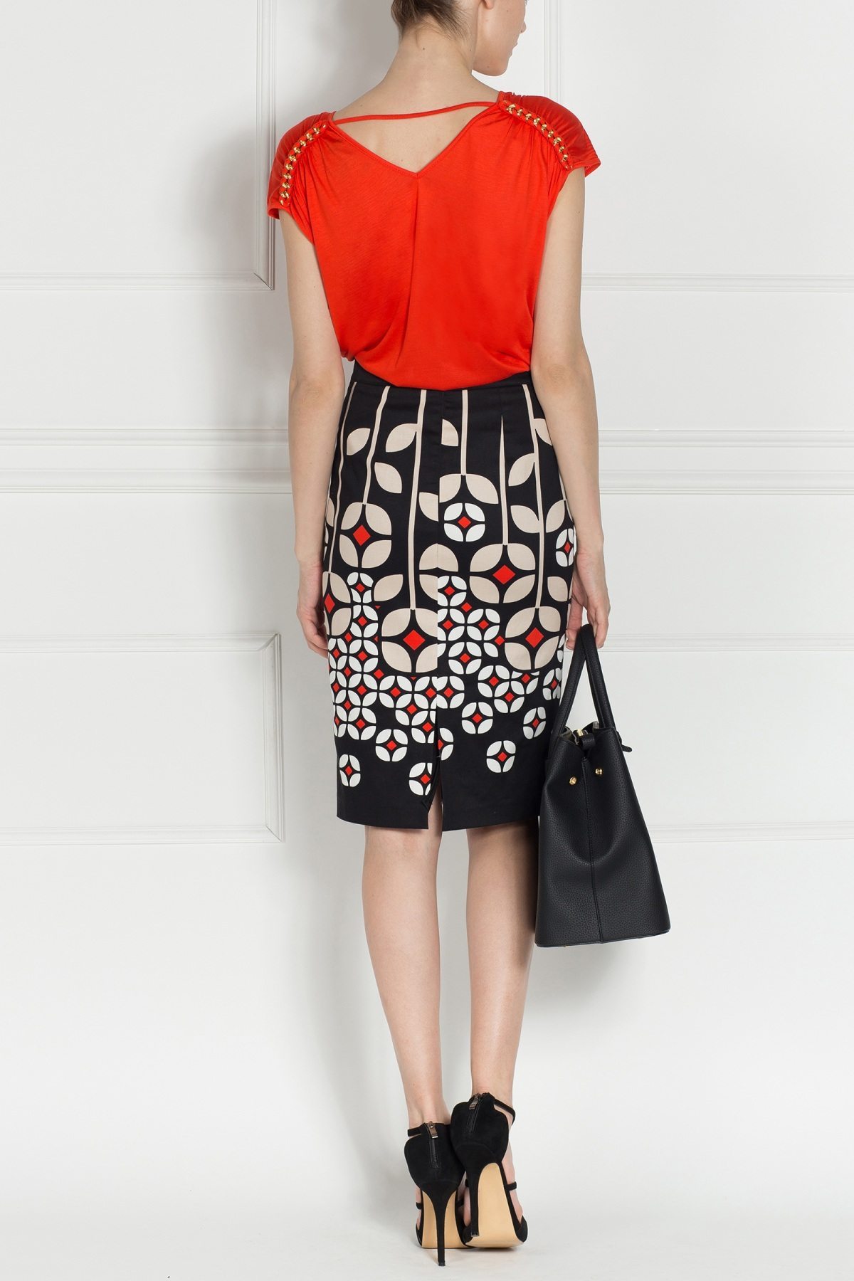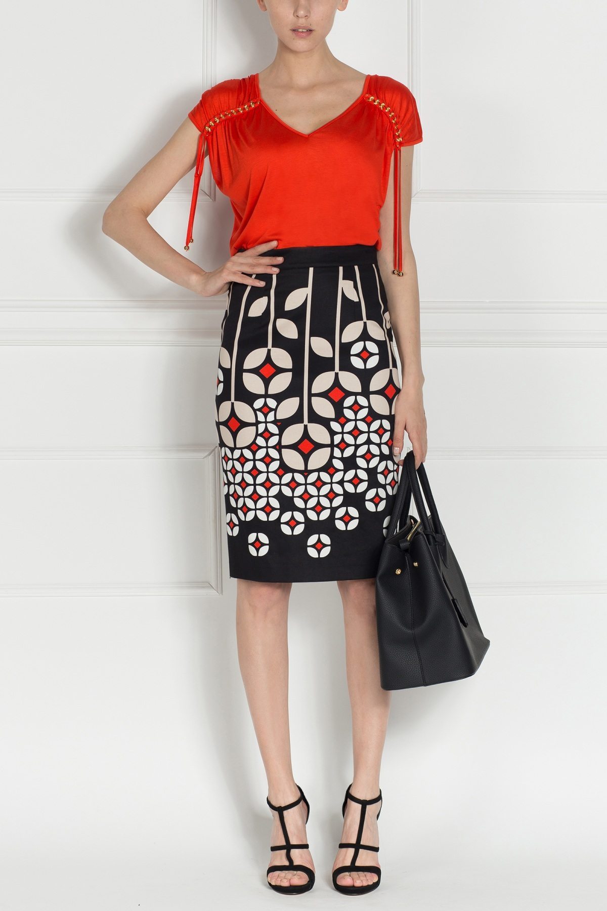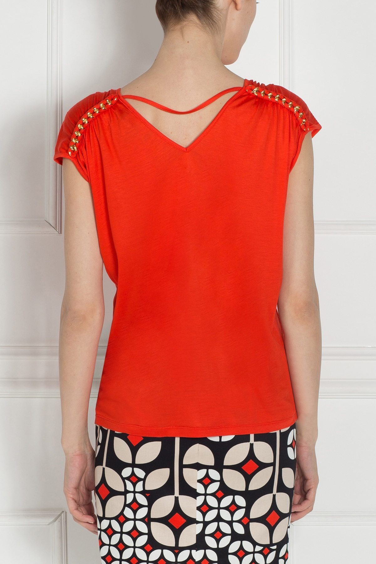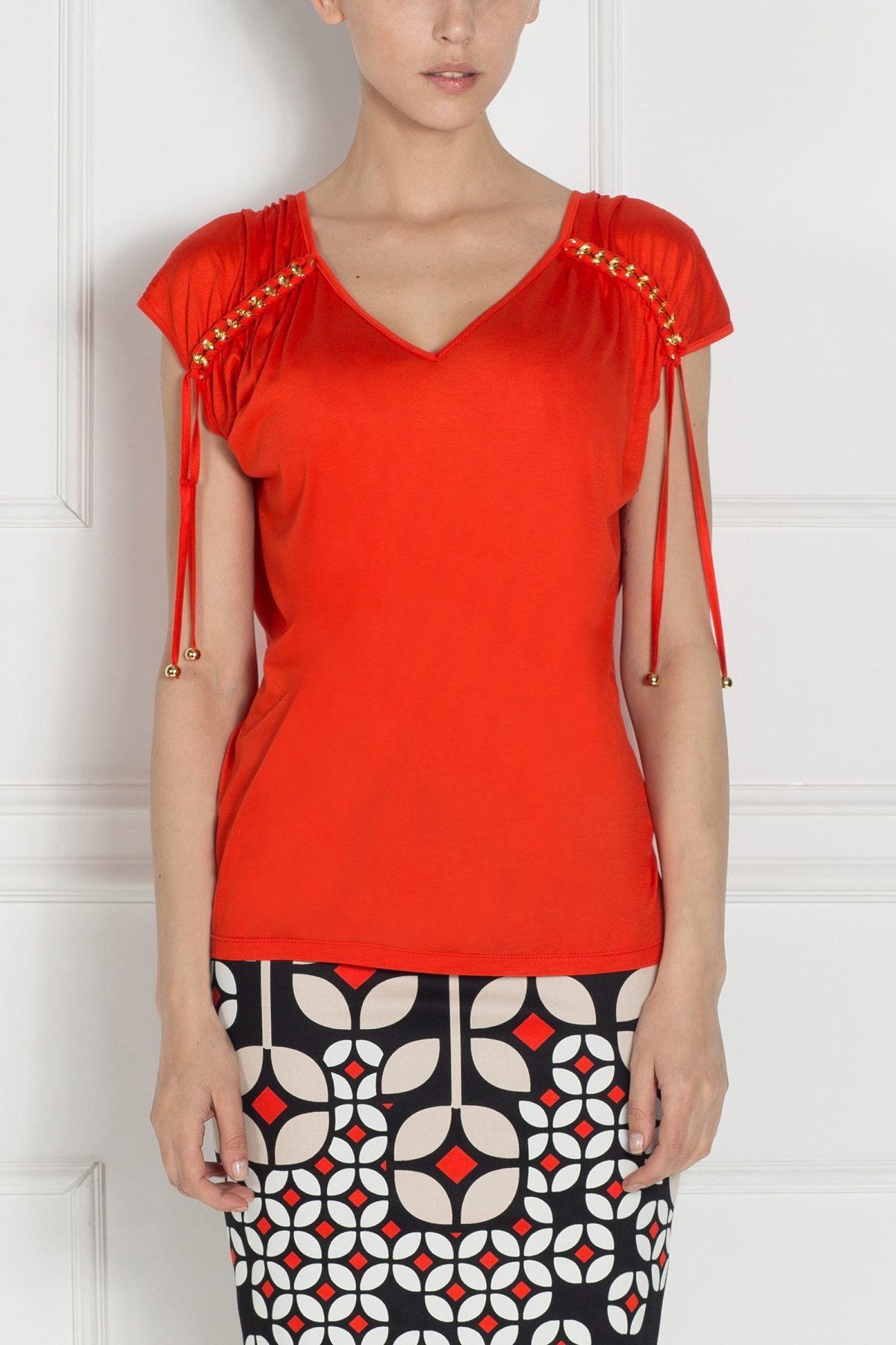 Top of elastic fabric, 3/4 sleeve with a string  and applied metal chain on the shoulder, v-neckline. This top is a versatile piece that should not miss from the ladies wardrobe. It can be worn both with a pencil skirt, classic trousers but also with a pair of jeans.