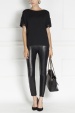 Top with round neckline, short sleeves and leather inserts, easy tailoring/cut from a comfortable material it is ideal for sunny fall/ autumn days, matching all silhouettes. Wear the top with uni trousers and pumps for a relaxing walk in the park or a pencil skirt and stiletto shoes