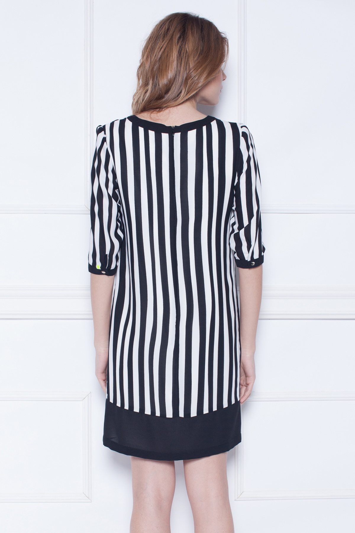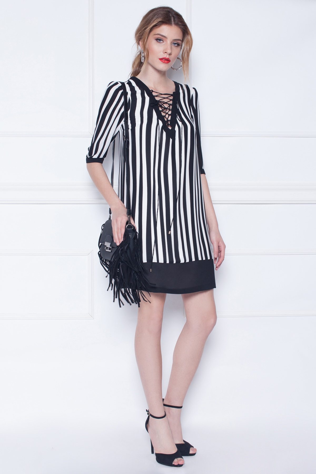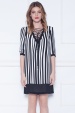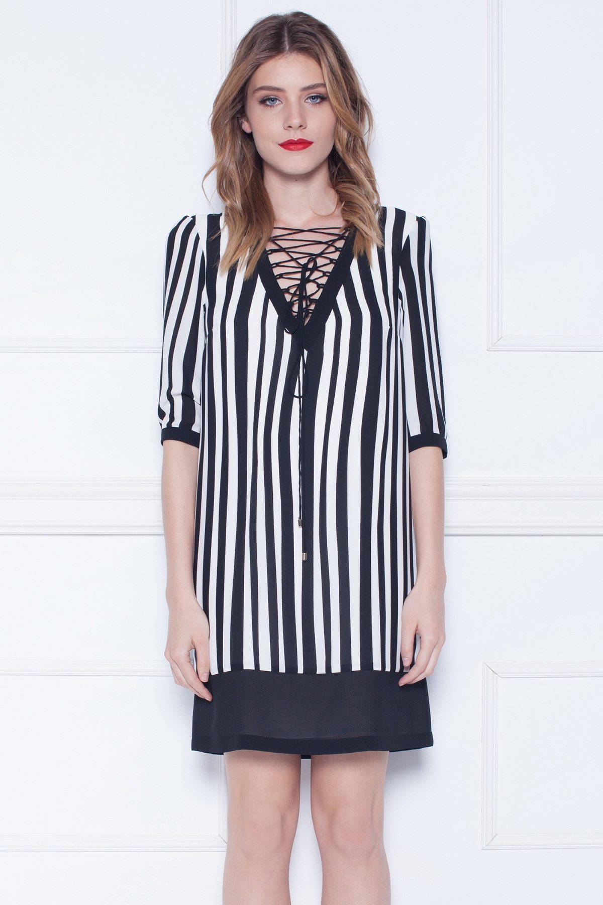 Product description This dress with straight cut and irregular stripes print, stands out thanks to the accessorized neckline with lace. Depending on the occasion, wear it with black flats or sandals with heels.