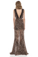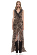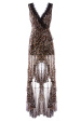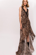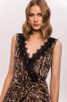 Rochie petrecuta, prindere cu siret in talie, decolteu adanc pe spate in V, decolteu in V in fata, volane si print leopard. Lungime asimetrica, dantela aplicata pe linia decolteului.