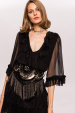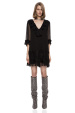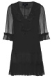 Detalii produs Rochie scurta din matase cu maneci trei sferturi, decolteu in V si snur subtire in decolteu. Detalii din dantela si volane.
