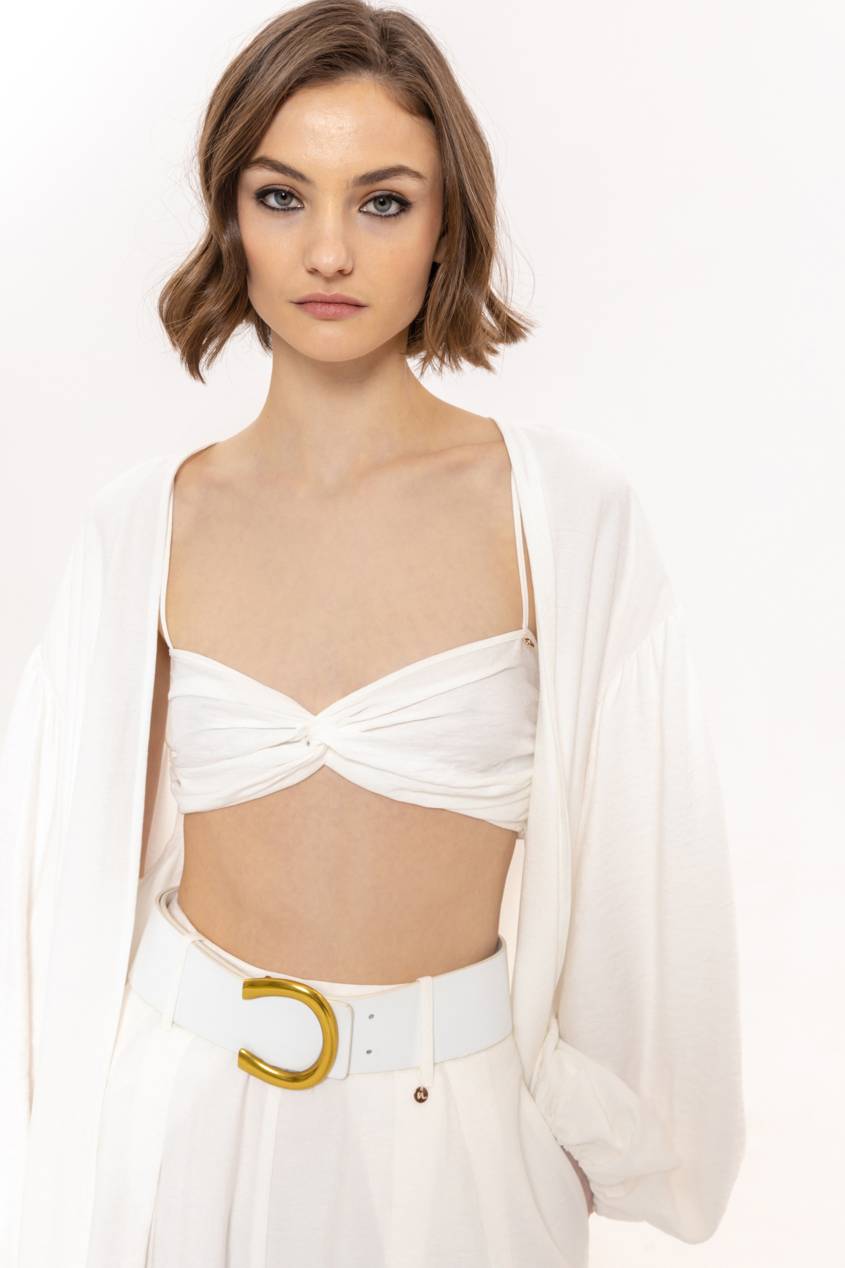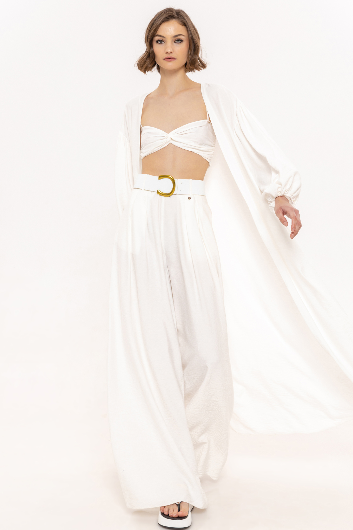 Modelul poarta masura 36, dimensiuni model: 178 cm inaltime, 82 cm bust, 59 cm talie, 89 cm sold